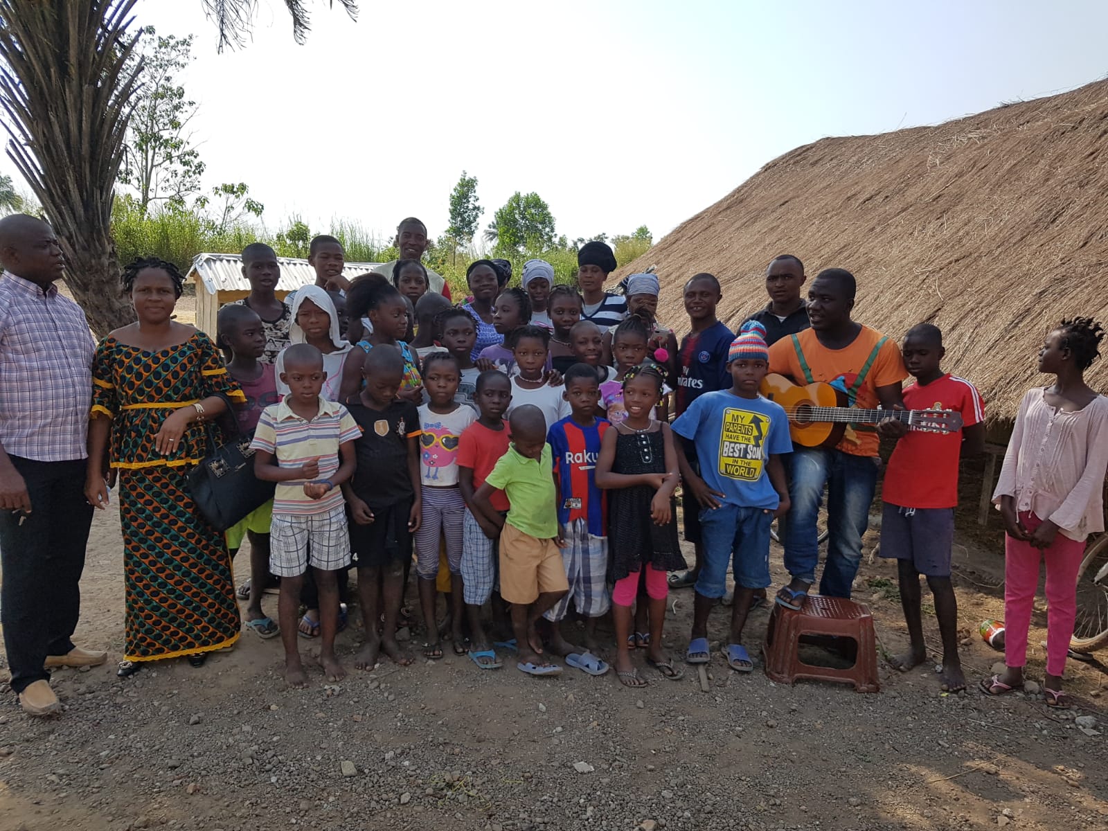 Voici l’ensemble des résidents du Centre Esaïe 58. A gauche, Daniel et Léontine, les responsables. Avec la guitare, Gédéon l’instituteur des petits, à sa gauche, Esaïe, le coursier et gardien du Centre, à gauche duquel se trouve Elie, l’instituteur des grands. Le Centre a aussi embauché un agriculteur, Joseph, pour gérer les plantations de riz ainsi que le potager.