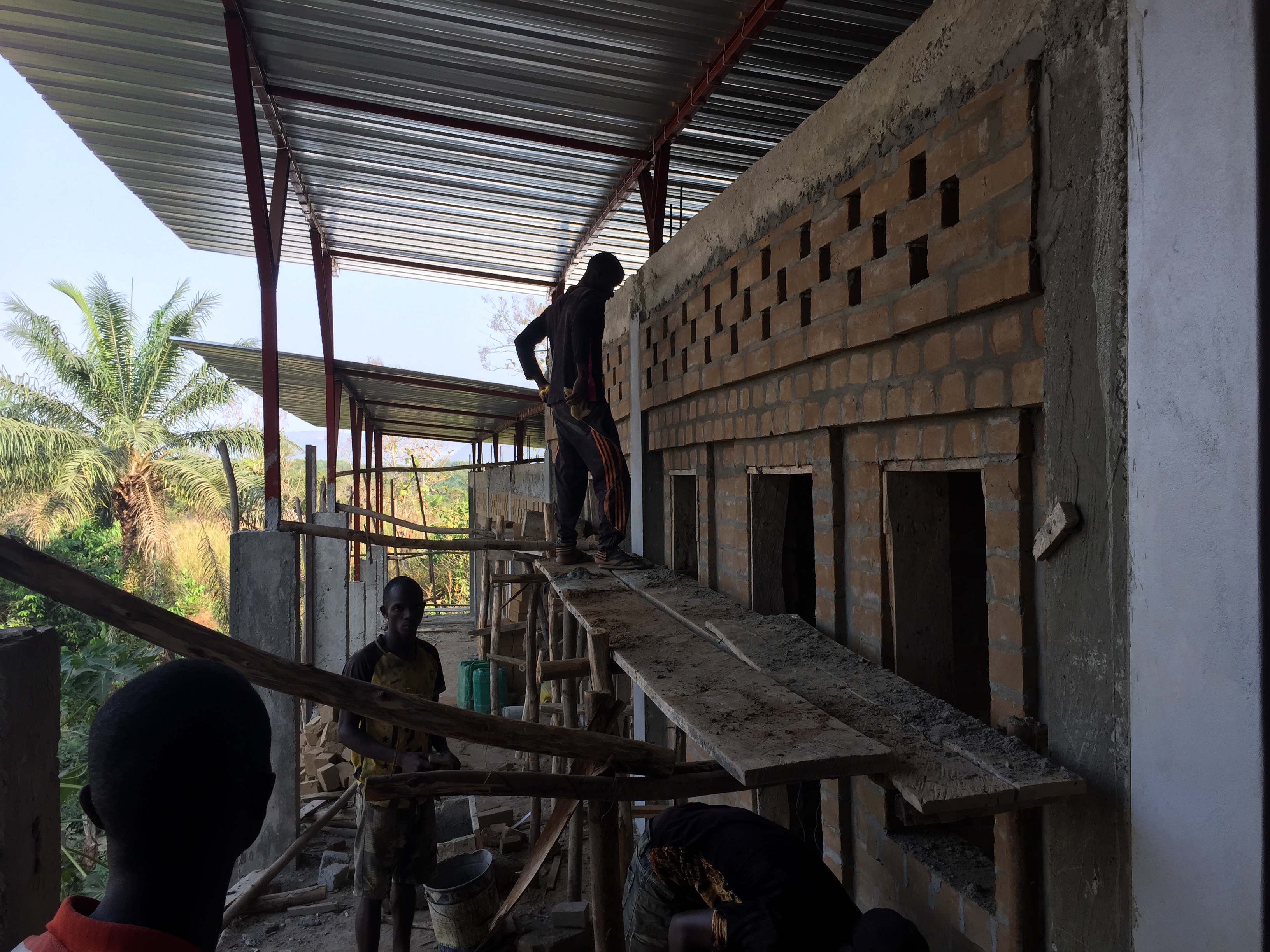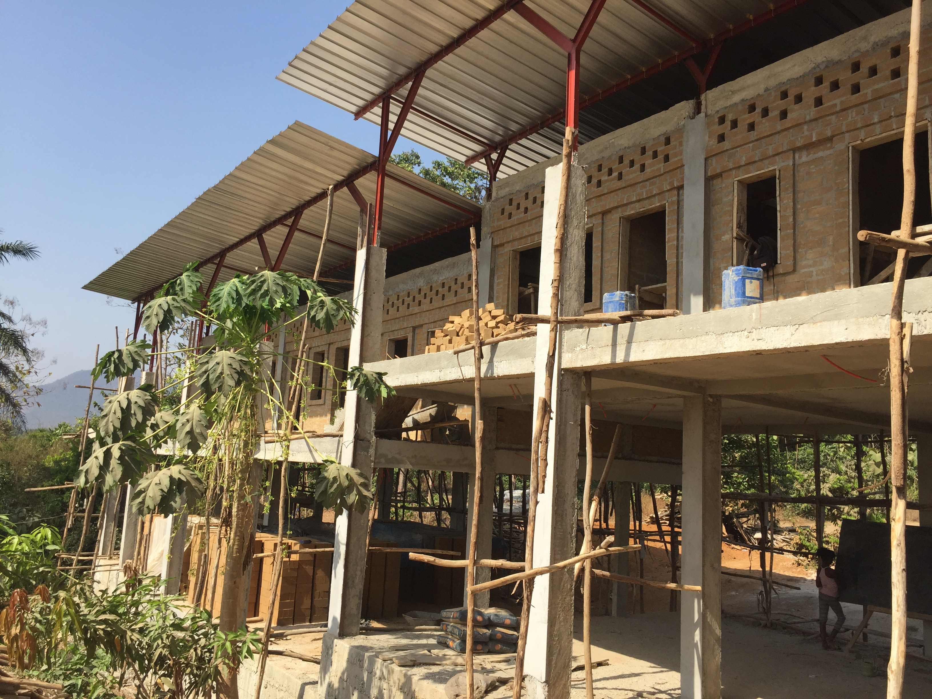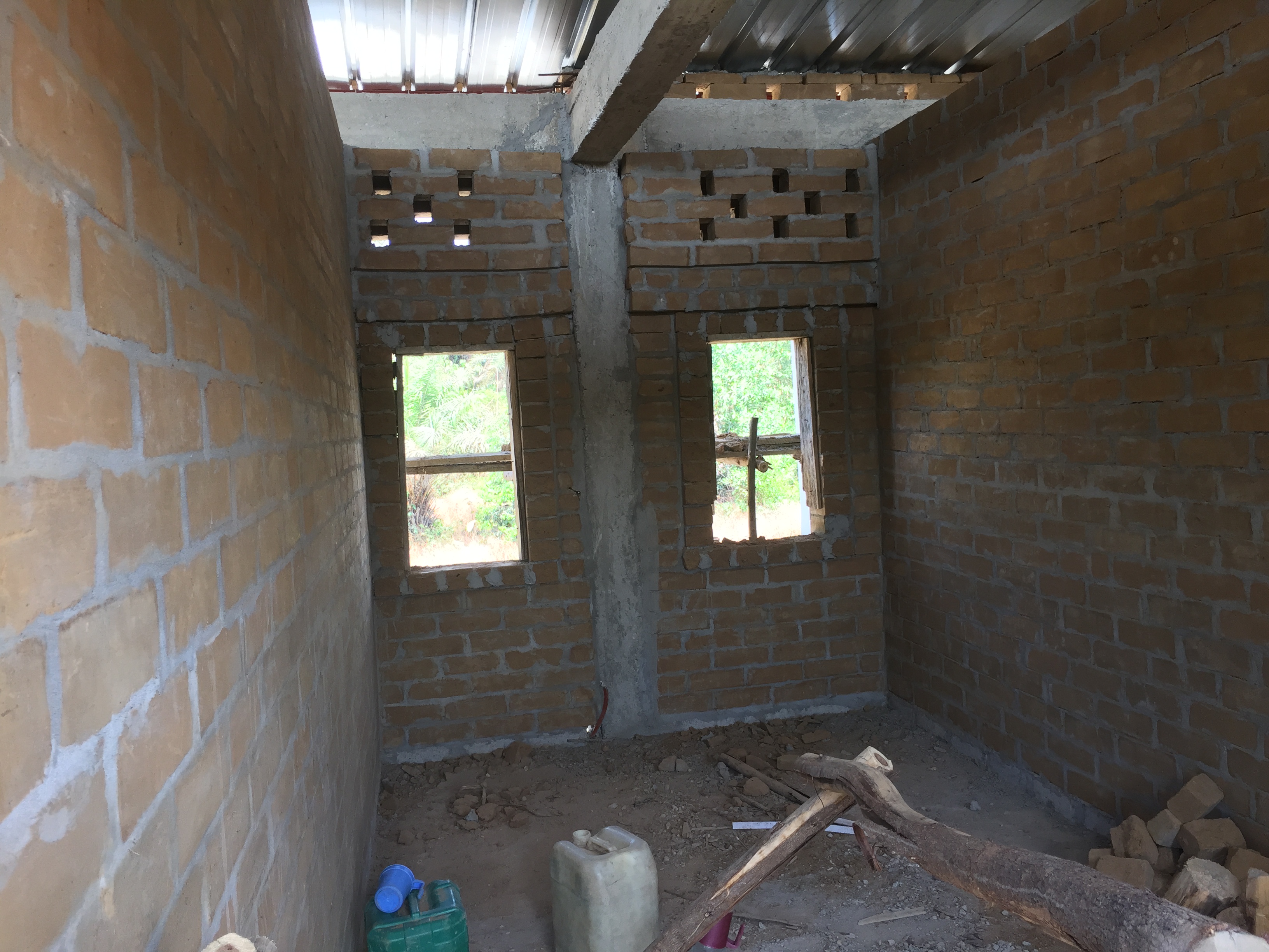 Les murs de briques de l’étage sont déjà montés. On distingue 7 chambres. 3 pour les garçons et 3 pour les filles, une chambre pour un couple. Chaque chambre comprendra 2 lits superposés ( 4 lits par chambre). Un bloc sanitaire au centre.