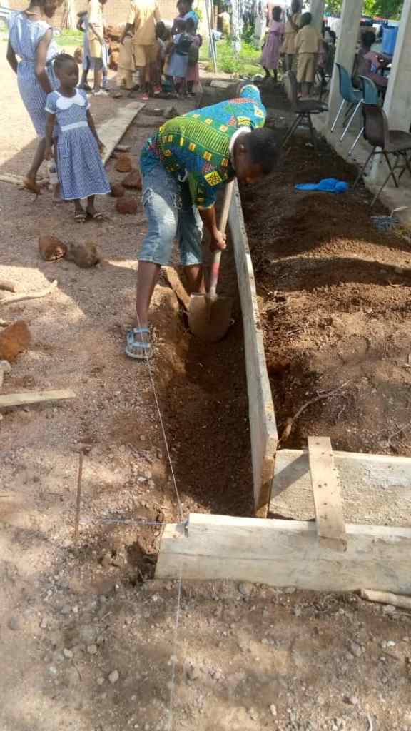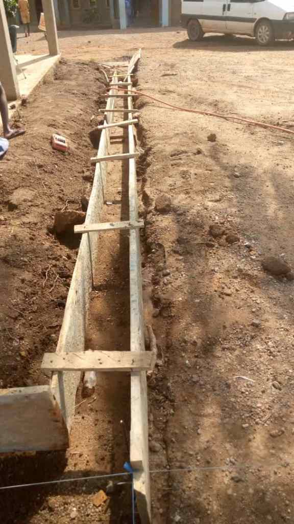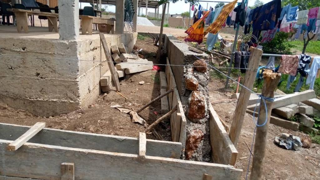 Le toit de chaume s’était déjà effondré, il a été remplacé par de la tôle, mais les fortes pluies typiques de la région, poussées par le vent, détrempent tout ce qui se trouve sous le préau. Il a donc fallu trouver une solution pour rendre le lieu utilisable même en pleine saison des pluies : en juillet et en août.