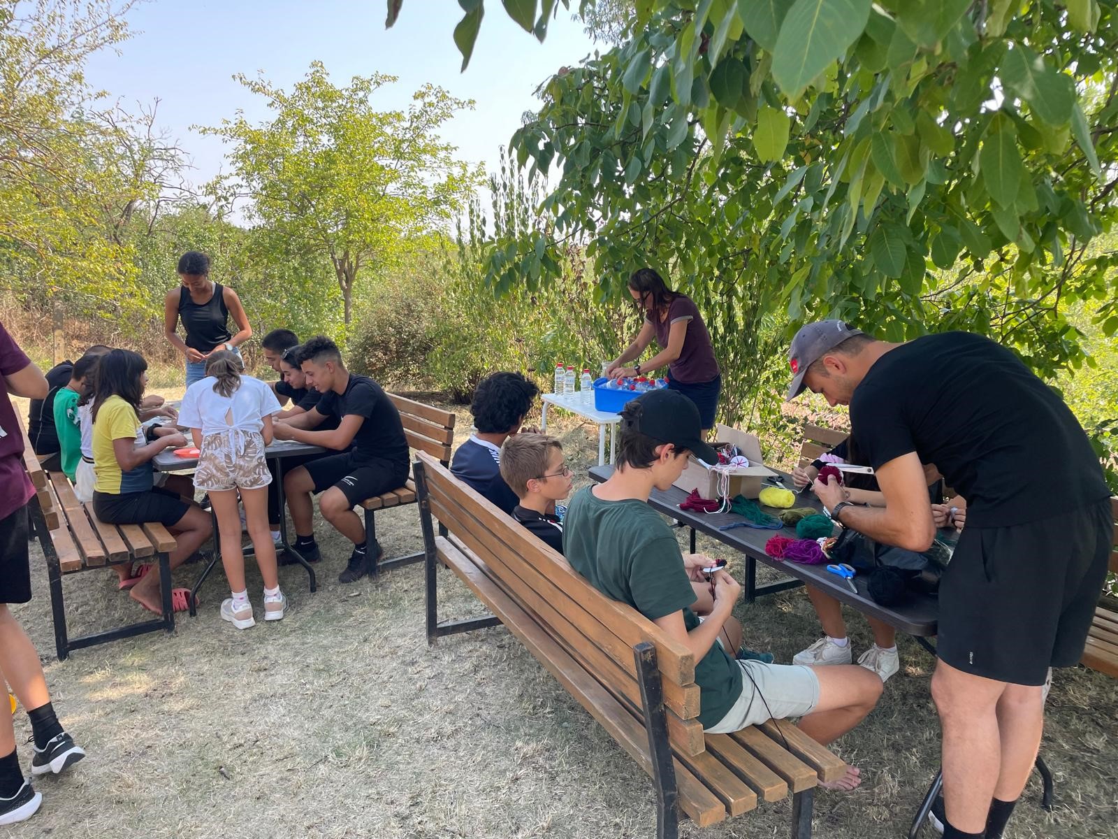 Nous avions deux ateliers : peinture sur caillou et atelier apprentissage de nœuds utiles pour tout faire . On a d’ailleurs fini par confectionner notre propre filet de volley!